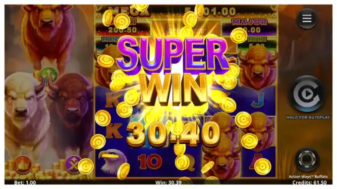 Action Ways™ Buffalo uses a 5×4 layout with ways instead of paylines, ranging from 1024 to 2400 ways. Wins are calculated left to right, and only the highest win per symbol combination is paid. The betting system is clean, with the total bet derived from the ways cost of 10.