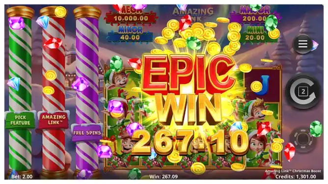 Free Spins elevate volatility even further by turning one random reel into a full Amazing Wild Reel—packed only with Wild Amazing symbols, some of which may include boost values. The Pick Feature adds another festive surprise, randomly activating and giving players a chance to multiply jackpots up to 5×. With multiple random triggers possible, the game maintains pace and unpredictability, ensuring no two sessions feel the same.