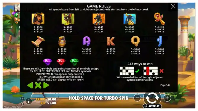 The game runs on a 5×3 layout with 243 ways to win. Money symbols land on reels 2–5, while Collect symbols on reel 1 gather values from adjacent reels. Super Collect adds random multipliers, further amplifying results.