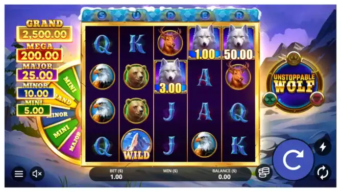 In Unstoppable Wolf™, the core mechanic is the RESPIN! feature triggered by stacked Wolves. Every new Wolf that lands locks in place and shifts left, creating escalating win potential. As players unlock special Wolves, respins become more powerful with bonus multipliers, guaranteed collections, and extra chances. The game also tracks reel indicators for SUPER RESPIN!, which guarantees all special modifiers in a single feature. Paws collected throughout the base game fuel jackpots from Mini to Grand.
