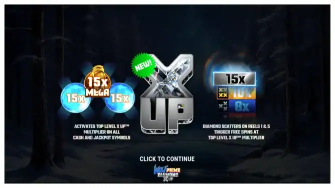 Wolf Prime Diamond X UP™ is a feature-packed slot where every scatter, token, and prize can escalate into huge rewards. The multi-level X UP™ trail drives the action, unlocking bigger cash multipliers and making every Free Spins round more powerful.
